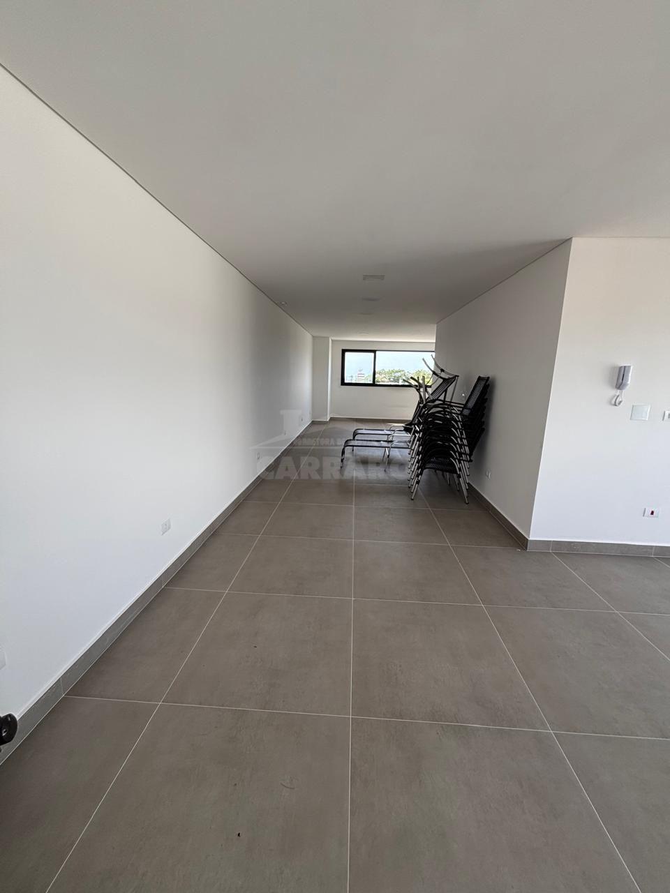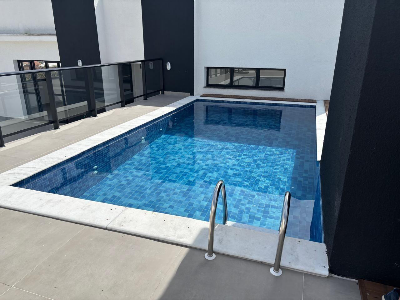 Salão de festa com churrasqueira, piscina e solário.